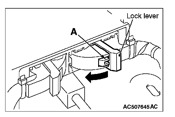 2. While pushing the part "A" indicated in the figure of the harness side connector, turn the lock lever to the direction of the arrow to release the lock lever, and disconnect the C-30 SRS-ECU connector.