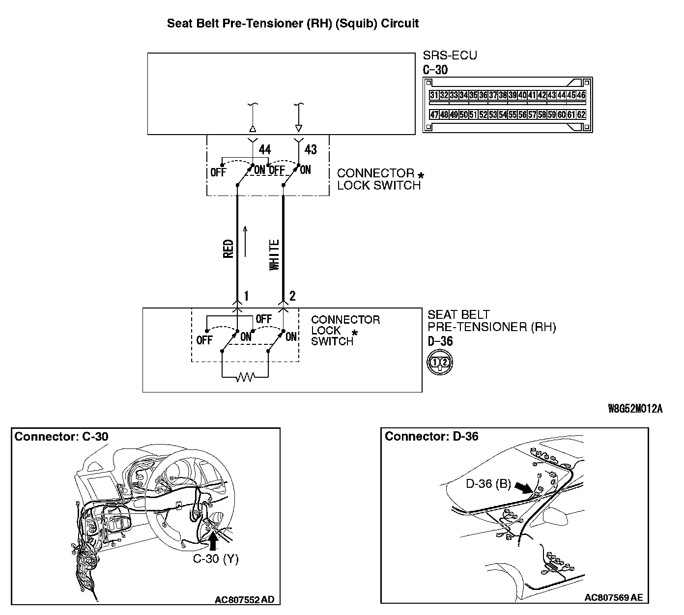 STEP 5. Check harness wires for short circuit to ground between SRS-ECU connector C-30 (terminal No.43 and 44) and passenger's seat belt pre-tensioner connector D-36 (terminal No.2 and 1).