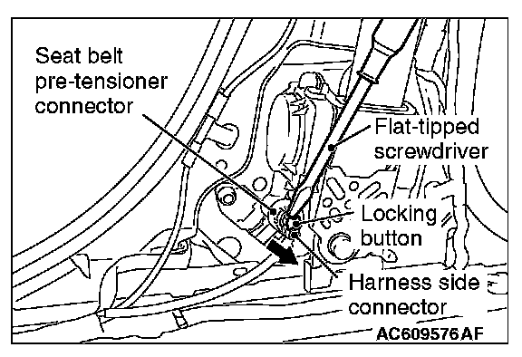 2. Disconnect passenger's seat belt pre-tensioner connector D-36. Use a flat-tipped screwdriver to unlock the locking button at the harness side connector by withdrawing it toward you in two stages, and then disconnect the connector.
