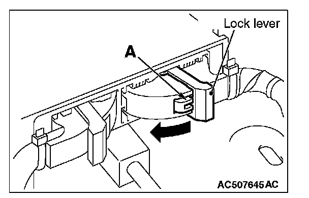 2. While pushing the part "A" indicated in the figure of the harness side connector, turn the lock lever to the direction of the arrow to release the lock lever, and disconnect the C-30 SRS-ECU connector.