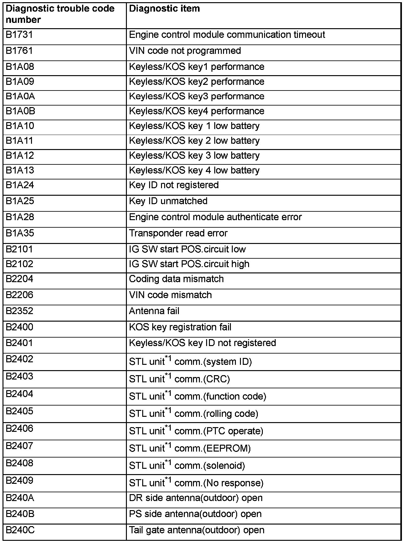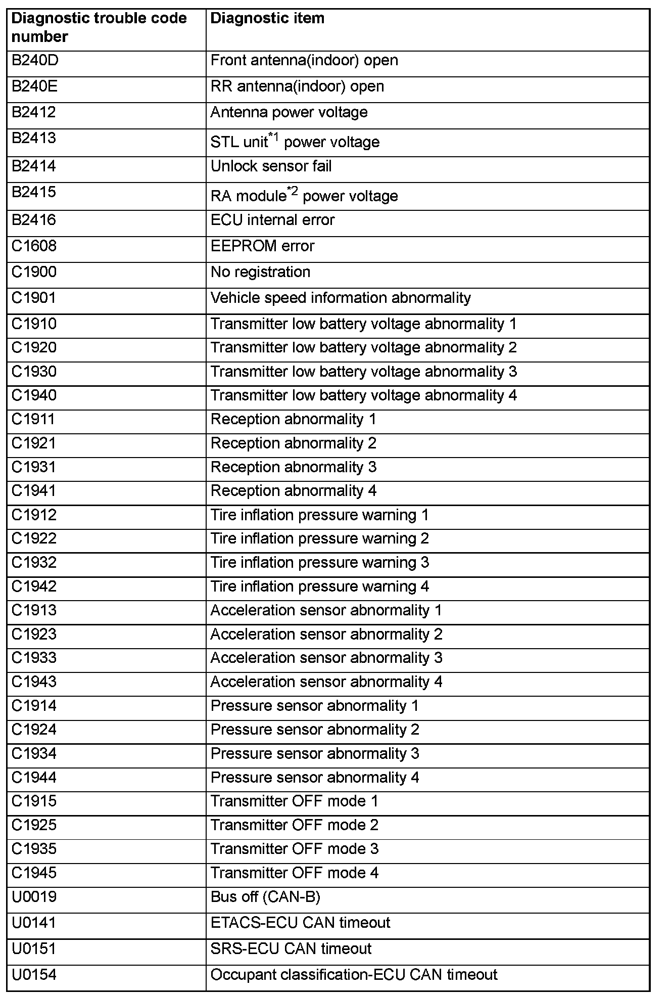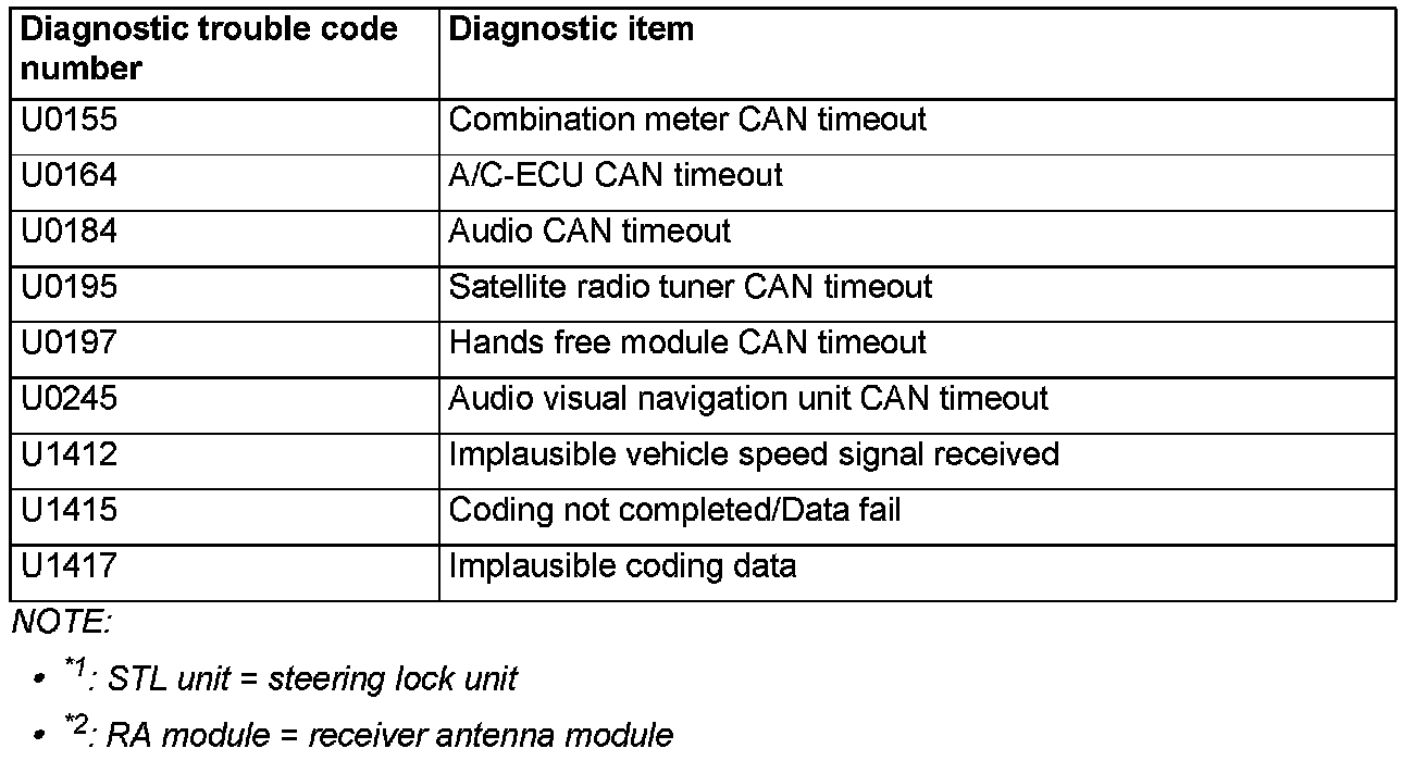 DIAGNOSTIC TROUBLE CODE CHARTCAUTION: During diagnosis, a DTC associated with other system may be set when the ignition switch is turned on with connector(s) disconnected. On completion, confirm all systems for DTC(s). If DTC(s) are set, erase them all.