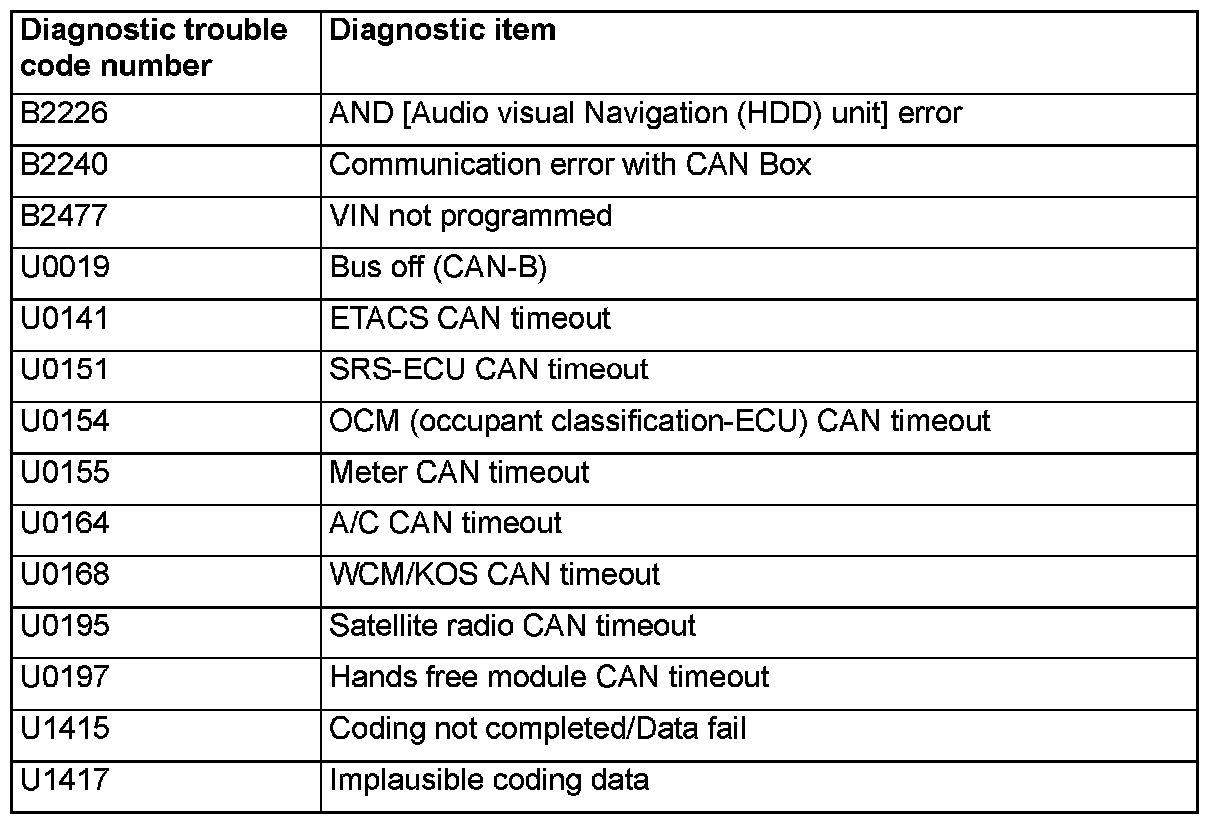 DIAGNOSTIC TROUBLE CODE CHARTCAUTION: On troubleshooting, if the ignition switch is turned ON while disconnecting connector(s), diagnostic trouble code(s) associated with other system may be set. On completion, confirm all systems for diagnostic trouble code(s). If diagnostic trouble code(s) are set, erase them all.
