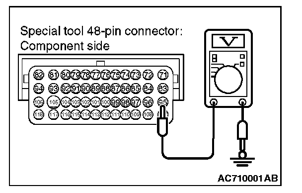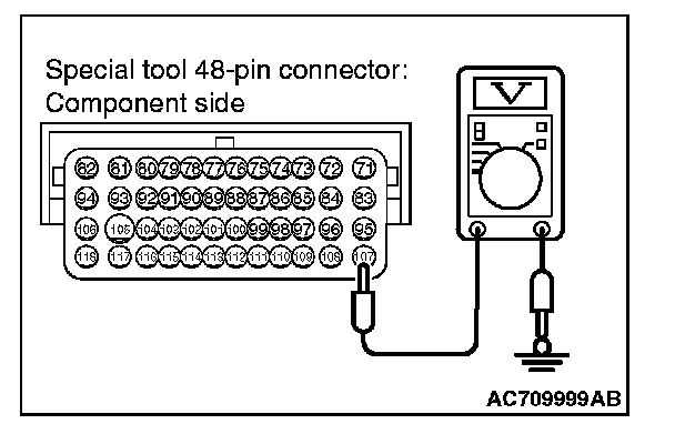 5. Measure the power supply voltage between special tool 48-pin connector terminal number 107 (ECM connector B-109 terminal number 107) and body ground.