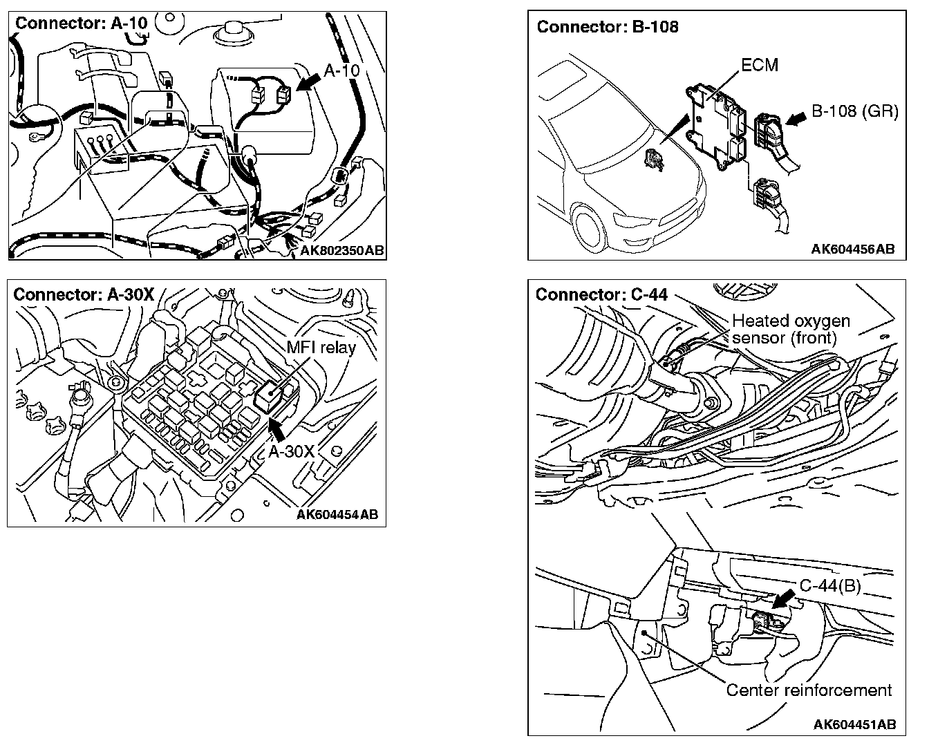 STEP 8. Check for harness damage between MFI relay connector A-30X (terminal No. 2) and heated oxygen sensor (front) connector C-44 (terminal No. 1).