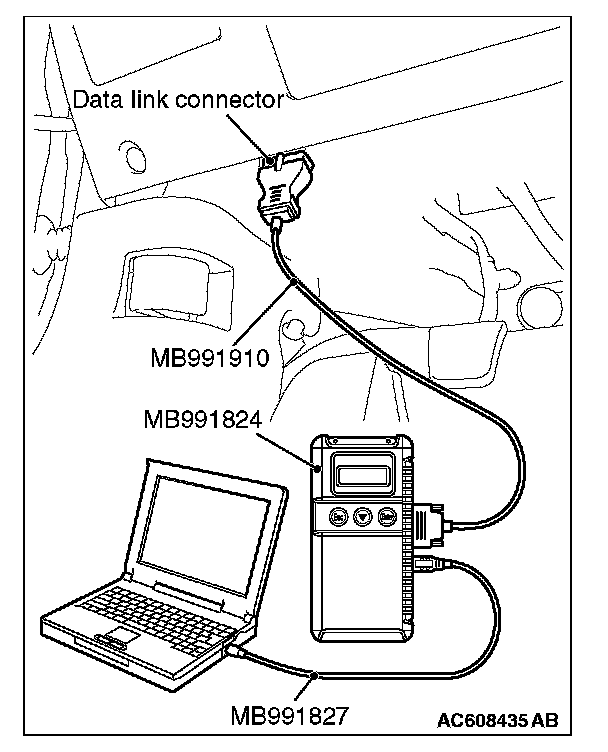 CAUTION: To prevent damage to scan tool MB991958, always turn the ignition switch to the "LOCK" (OFF) position before connecting or disconnecting scan tool MB991958.