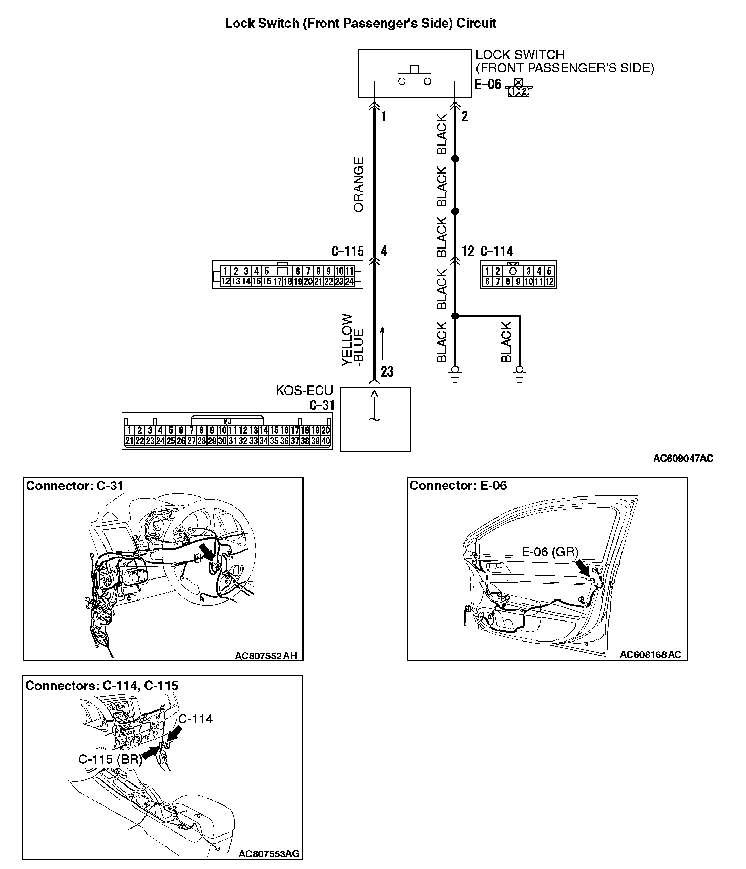 Q : Are KOS-ECU connector C-31 and lock switch (front passenger's side) connector E-06 in good condition?