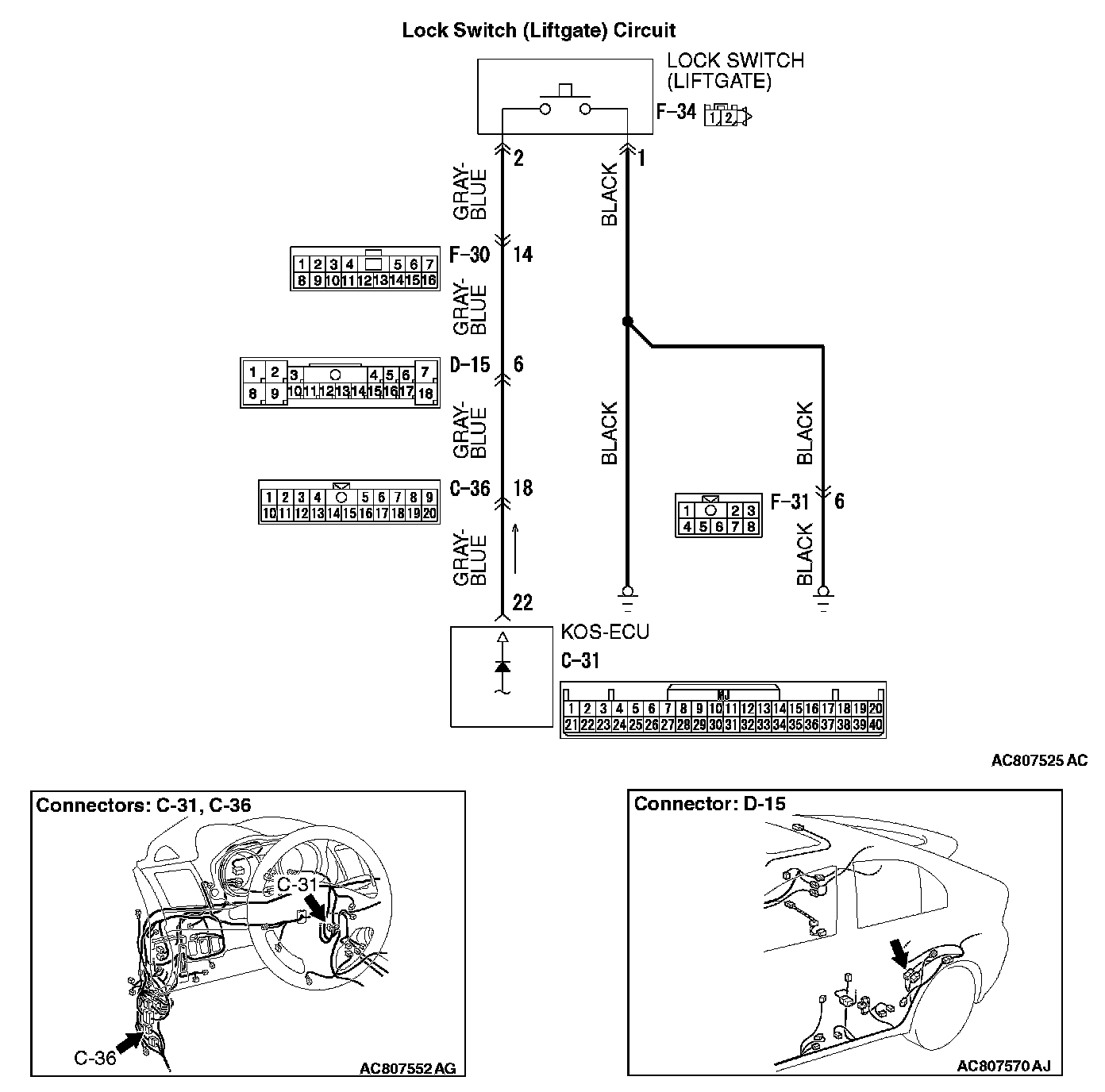 Q : Are KOS-ECU connector C-31 and lock switch (liftgate) connector F-34 in good condition?