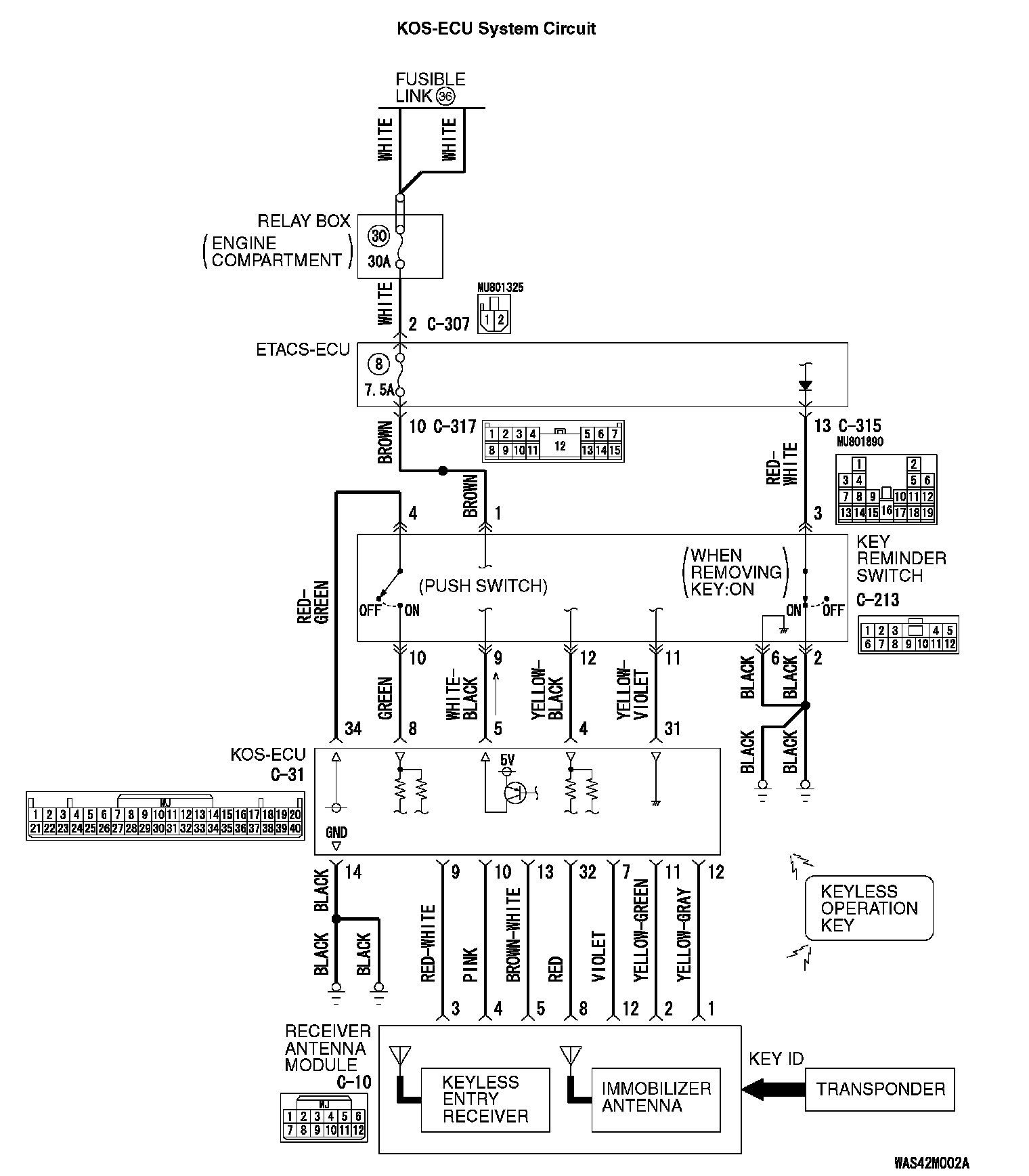 NO : Check the KOS-ECU C-31 connector, the key reminder switch connector C-213, the ETACS-ECU connector C-317, and the wiring harness between the KOS-ECU connector C-31 (terminal No. 8, 34) and the C-213 key reminder switch connector (terminal No. 10, 4), and repair them if necessary. If they are normal, replace the key reminder switch.