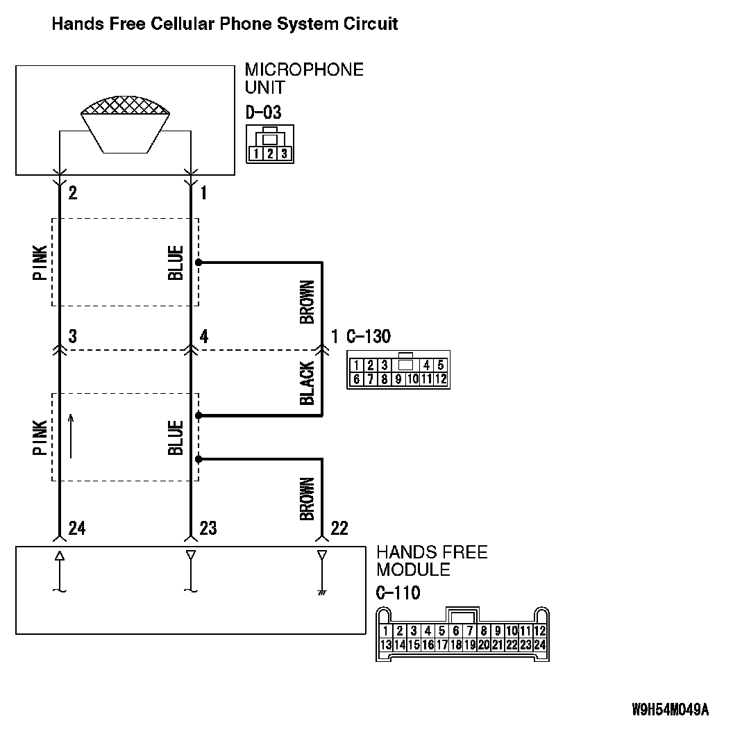 2. Check the wiring harness between hands free module connector C-110 (terminal 1) and microphone unit connector D-03 (terminal 23)