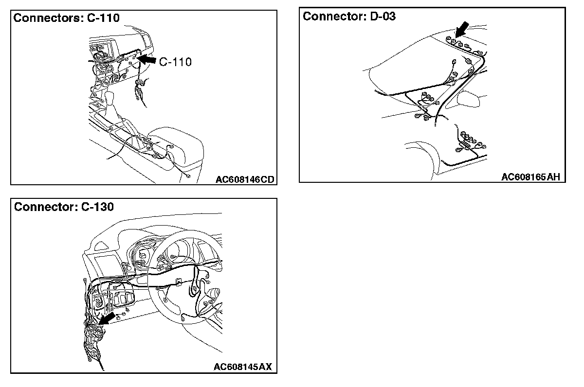 STEP 2. Check hands-free module connector C-110 and microphone unit connector D-03 for loose, corroded or damaged terminals, or terminals pushed back in the connector.