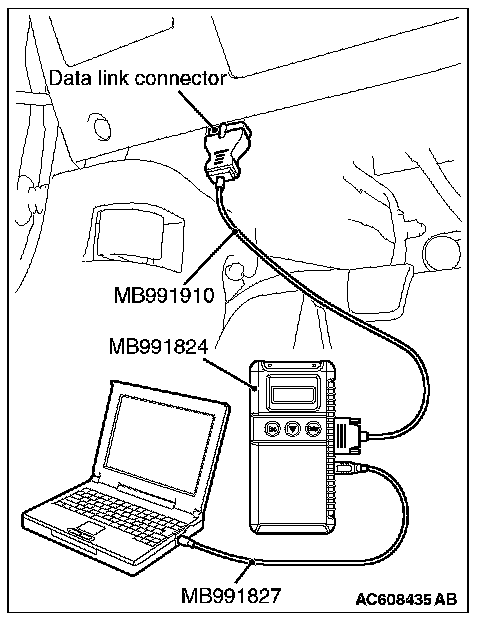 CAUTION: To prevent damage to scan tool MB991958, always turn the ignition switch to the "LOCK" (OFF) position before connecting or disconnecting scan tool MB991958.
