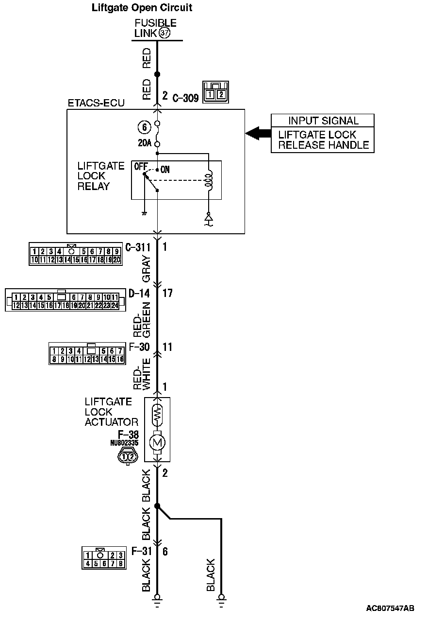 STEP 9. Check the wiring harness between ETACS-ECU connector C-311 (terminal 1) and liftgate lock actuator connector F-38 (terminal 1).