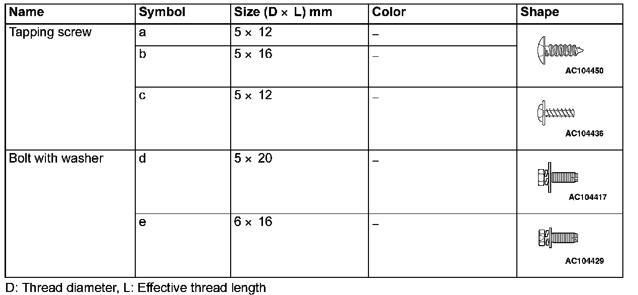 The following bolts and screws are used for installing the instrument panel. Bolts and screws are indicated marks shown in the illustration in the sections of "Removal and Installation" and "Disassembly and Assembly".