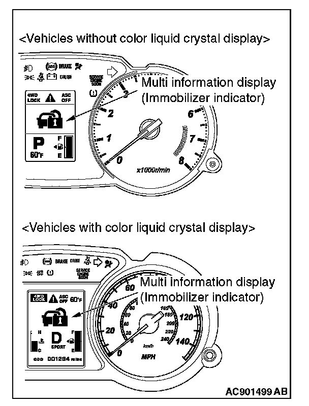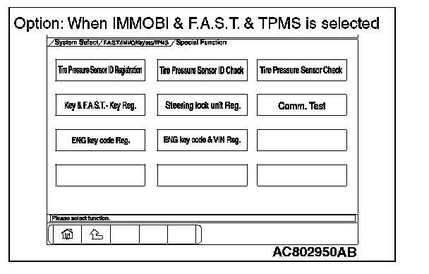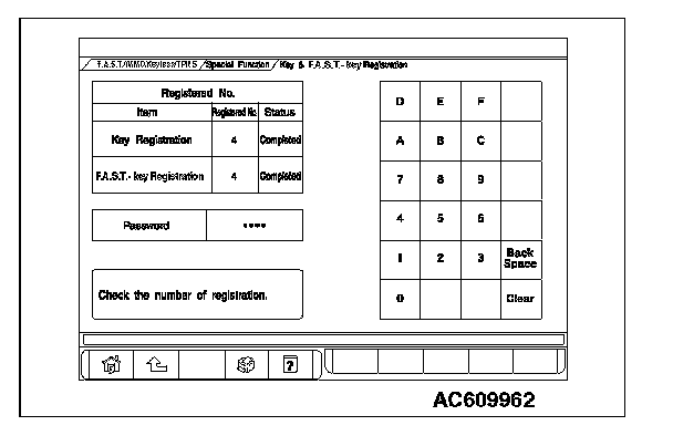 By operating the scan tool MB991958 (M.U.T.-III sub assembly) screen, the ID code registration and the TPMS can be registered and antenna communication required to the keyless operation system can be performed. KOS and keyless operation key are indicated as F.A.S.T and F.A.S.T.-key respectively in the scan tool MB991958 (M.U.T.-III sub assembly) screen.