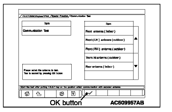 1. Select the antenna to be tested on "Communication Test" screen, and press the OK button with the keyless operation key placed within the communication operational area.