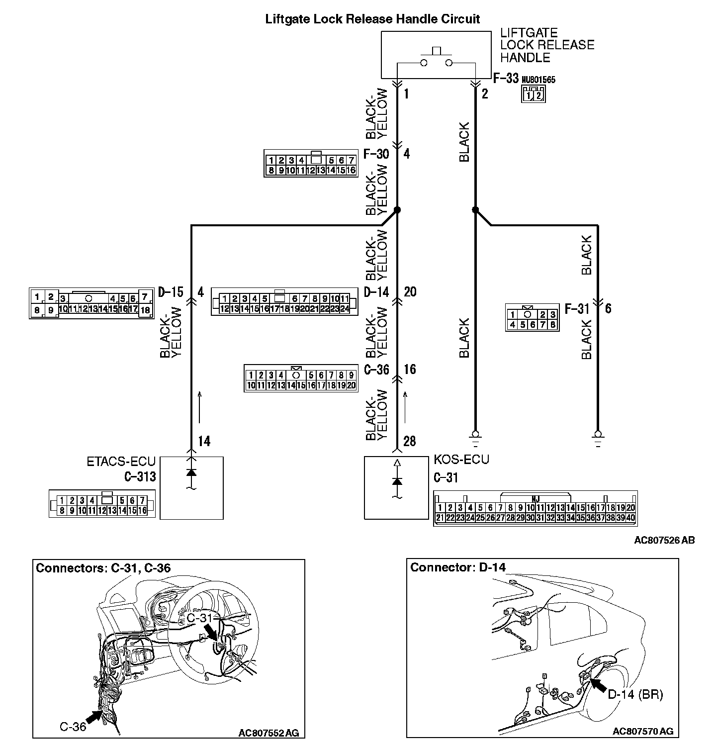 Q : Are KOS-ECU connector C-31 and liftgate lock release handle connector F-33 in good condition?