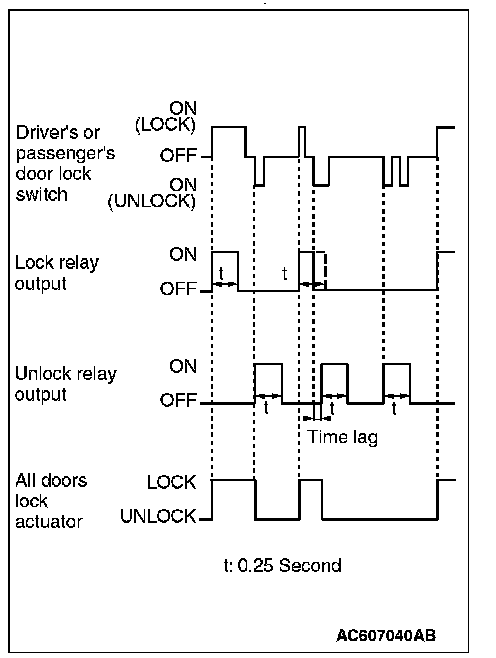 When the door is locked and unlocked by driver's or passenger's door lock switch consecutively, the ETACS-ECU operates its door lock relay and passes a current through the door lock actuators of all the doors for 0.25 second to lock all the doors (including the liftgate). Then, the ETACS-ECU operates its door unlock relay and passes a current through the door lock actuators of all the doors (including the liftgate) for 0.25 second to unlock all the doors (including the lift-gate). Due to this, there may be a time lag between the driver's or passenger's door lock switch actuation and the time when all the doors (including the liftgate) are unlocked.