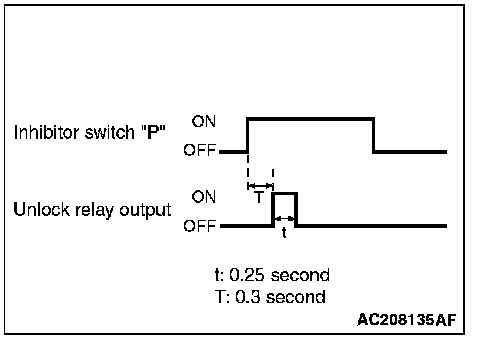 When the selector lever is shifted to the P position with the ignition switch turned ON, the transmission range switch "P" turns ON, ETACS-ECU turns the unlock relay output ON for 0.25 seconds to unlock all the doors (including the liftgate).
