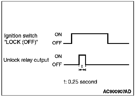 When the ignition switch is turned to the " LOCK (OFF)" position, ETACS-ECU turns the unlock relay output ON for 0.25 second to unlock all the doors.
