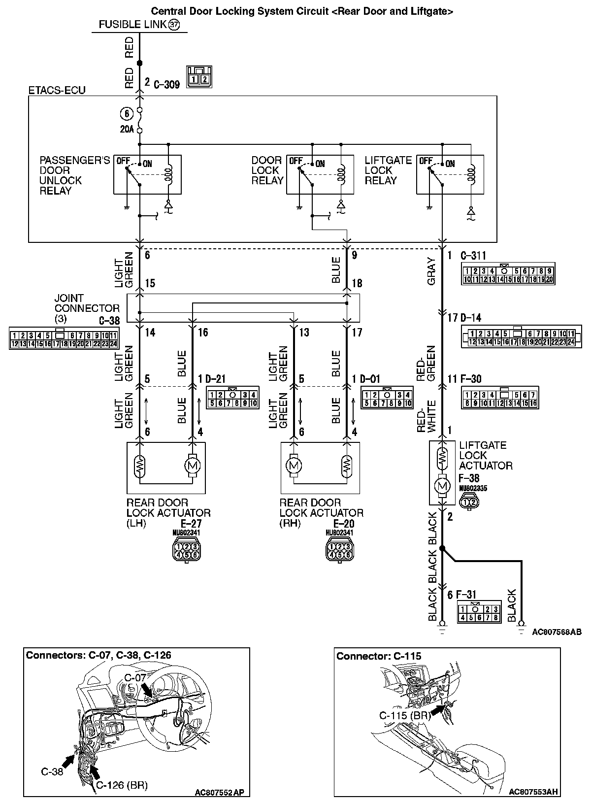 STEP 23. Check the wiring harness between ETACS-ECU connector C-311 (terminal No. 1) and liftgate lock actuator connector F-38 (terminal No. 1).