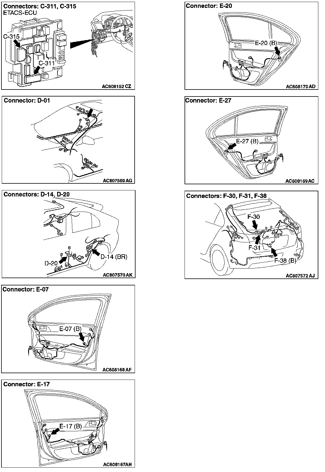STEP 9. Check the wiring harness between ETACS-ECU connector C-315 (terminals Nos. 5, 6) and front door lock actuator (RH) connector E-07 (terminals Nos. 6, 4).