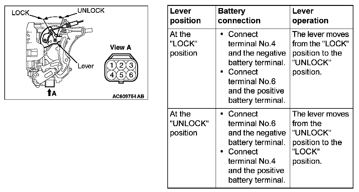 Remove the front door lock actuator (LH). The illustration shows when the door lock actuator is viewed from inside the door. Refer to Door Handle and Latch.