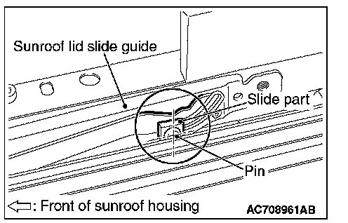 3. Push the slide part of the sunroof lid slide guide forward. Align the pin center of the slide part with the location shown in the illustration.