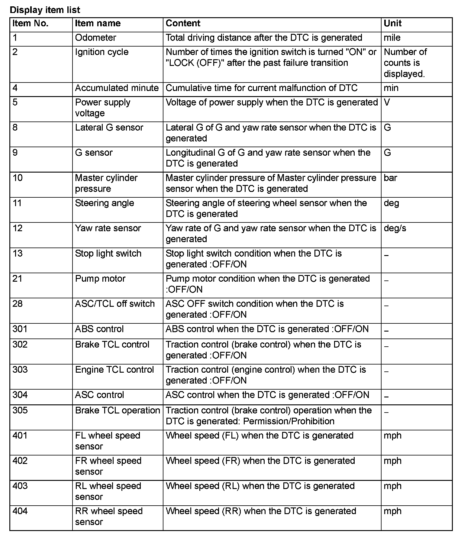 When detecting fault and storing the DTC, the ECU connected to CAN bus line obtains the data before the determination of the DTC and the data when the DTC is determined, and then stores the ECU status of that time. By analyzing each data from scan tool, the troubleshooting can be performed more efficiently. The displayed items are as the table below.