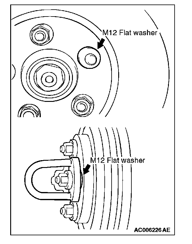 ^ When the on-the-car type lathe is used, first install M12 flat washer on the stud bolt in the brake disk side according to the figure, and then install the adapter. If the adapter is installed with M12 flat washer not seated, the brake disk rotor may be deformed, resulting in inaccurate grinding.