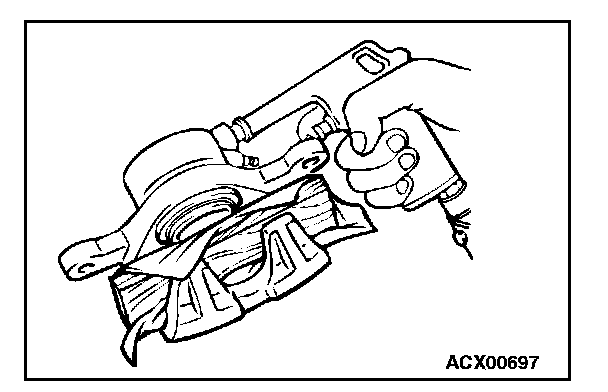 Cover the caliper body outer side with a cloth or similar materials. Blow compressed air through the brake hose installation area to remove the piston and piston boot.