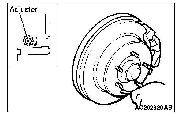 3. Remove the rear brake disk adjusting hole plug. Then insert a flat-tipped screwdriver to turn the adjuster to the arrow direction (to expand the shoe) until the parking brake shoe makes contact and the disk can no longer be turned. Back off the adjuster to the opposite direction by five notches.
