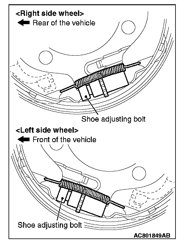 Install the adjuster assemblies. The shoe adjusting bolt should be mounted to the rear of the vehicle for the right wheel, and to the front of the vehicle for the left wheel.