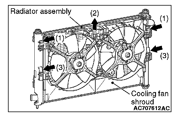 1. Release the upper locks of the radiator assembly from the fan, fan motor and cooling fan shroud assembly.