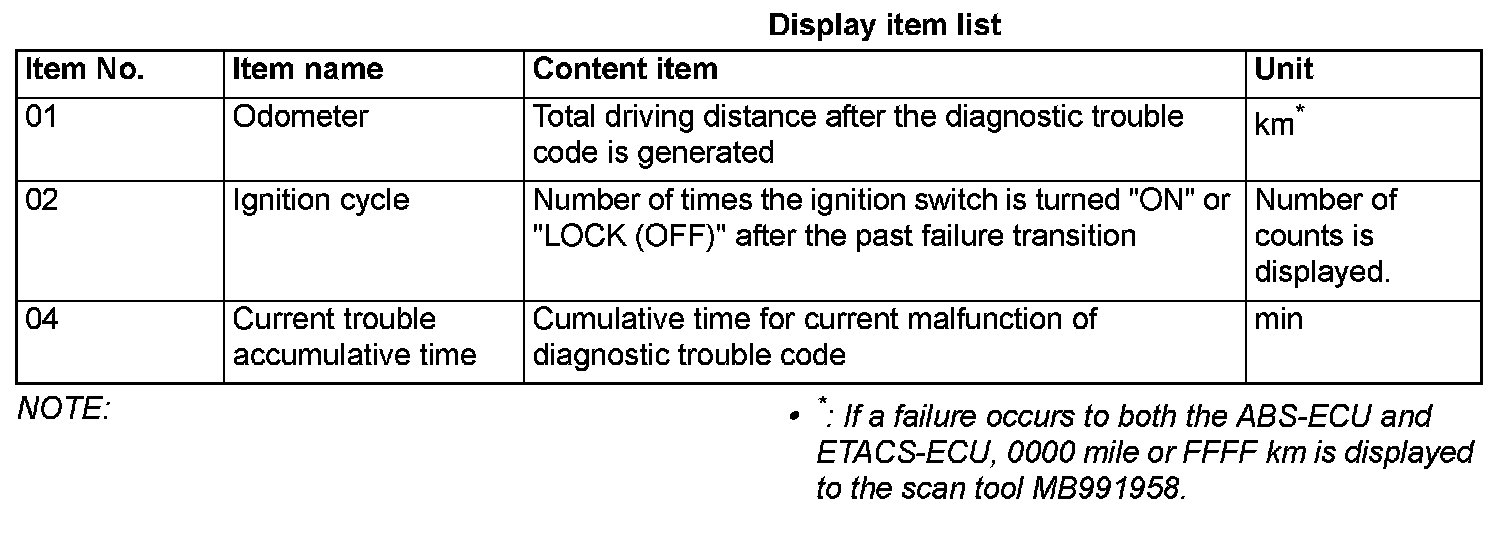 When detecting fault and storing the DTC, the ECU connected to CAN bus line obtains the data before the determination of the DTC and the data when the DTC is determined, and then stores the ECU status of that time. By analyzing the data from scan tool, the troubleshooting can be performed more efficiently. The displayed items are as shown in the table below.