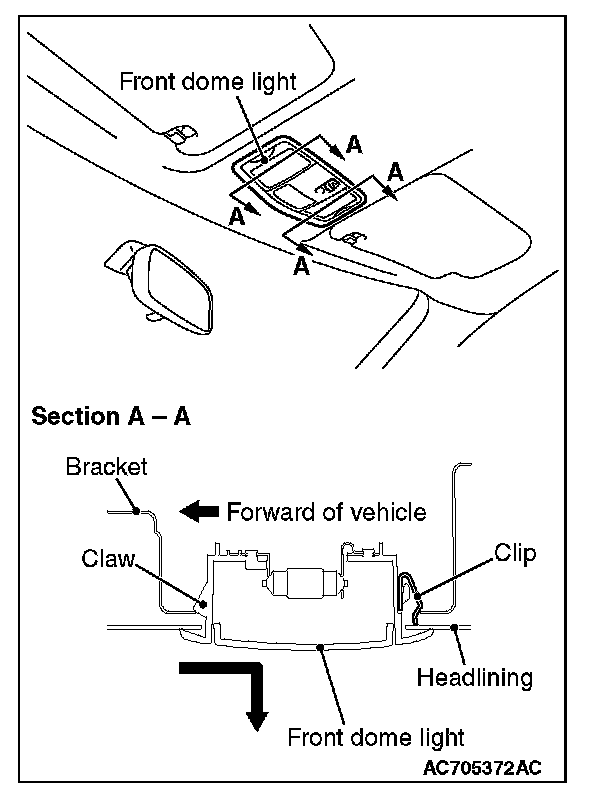 While pressing the front dome light toward the rear of the vehicle, slide the front side of the front dome light downward, and remove the front dome light.