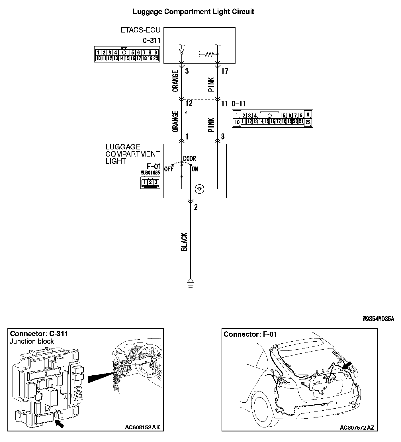 STEP 9. Check luggage compartment light connector F-01 and ETACS-ECU connector C-311 for loose, corroded or damaged terminals, or terminals pushed back in the connector.