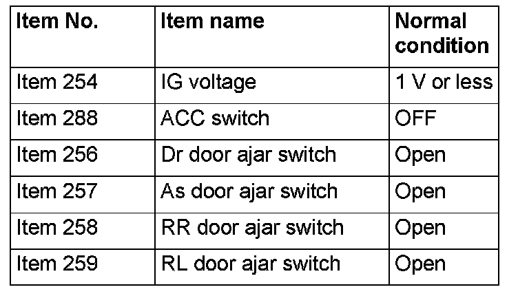 Q: Does scan tool MB991958 display the items "IG voltage", "ACC switch", "Dr door ajar switch", "As door ajar switch", "RR door ajar switch", and "RL door ajar switch" as normal condition?