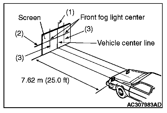 7. Place the vehicle on a level floor, perpendicular to a flat screen 7.62 meters (25.0 ft) away from the bulb center-marks on the fog light lens.
