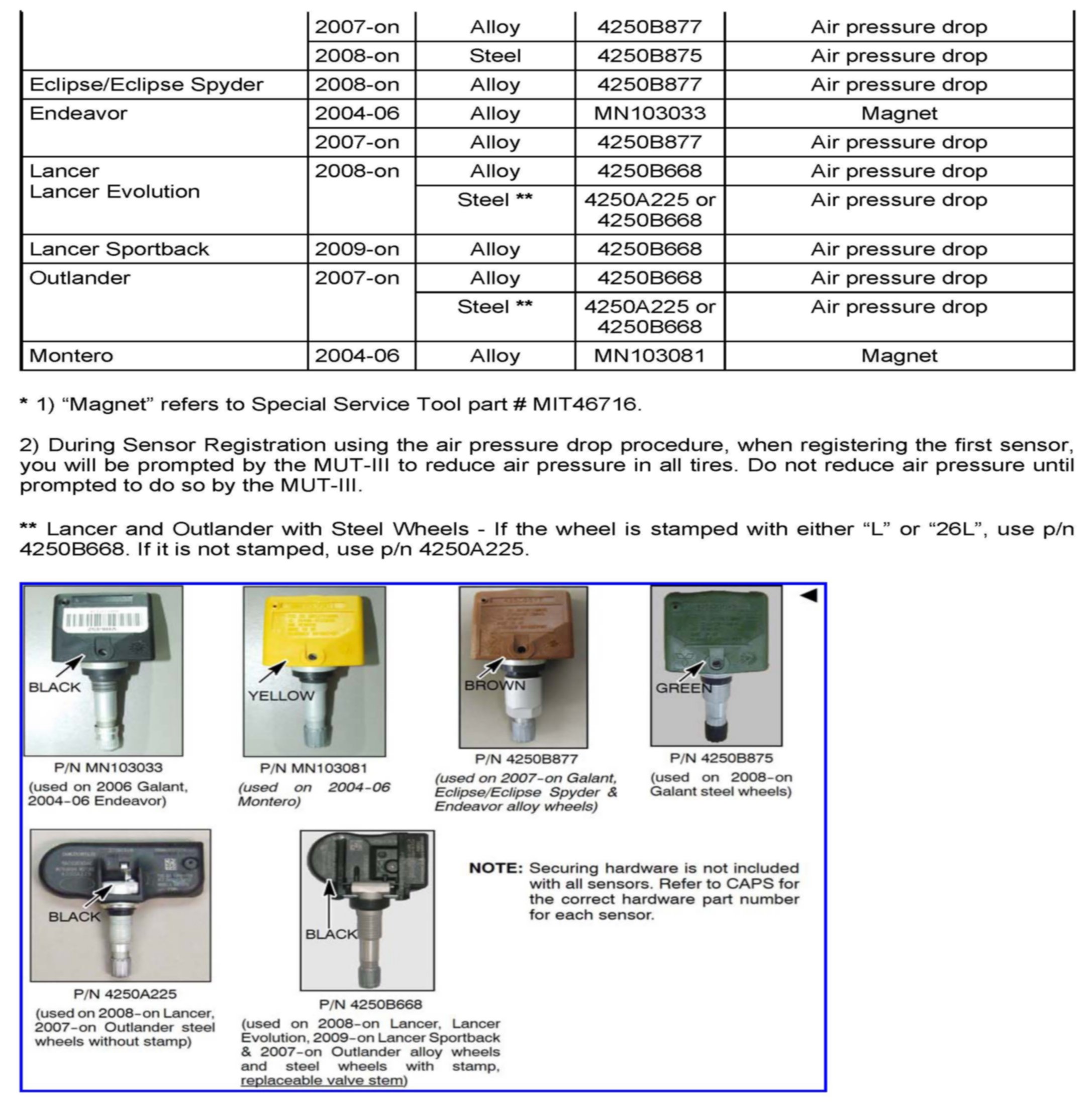 Replacement TPMS sensors will be activated when registered to the vehicle. Additionally, if tires are switched between vehicles, sensors must be reregistered for BOTH vehicles or DTCs will be set. The MUT-III is required to register TPMS sensors.