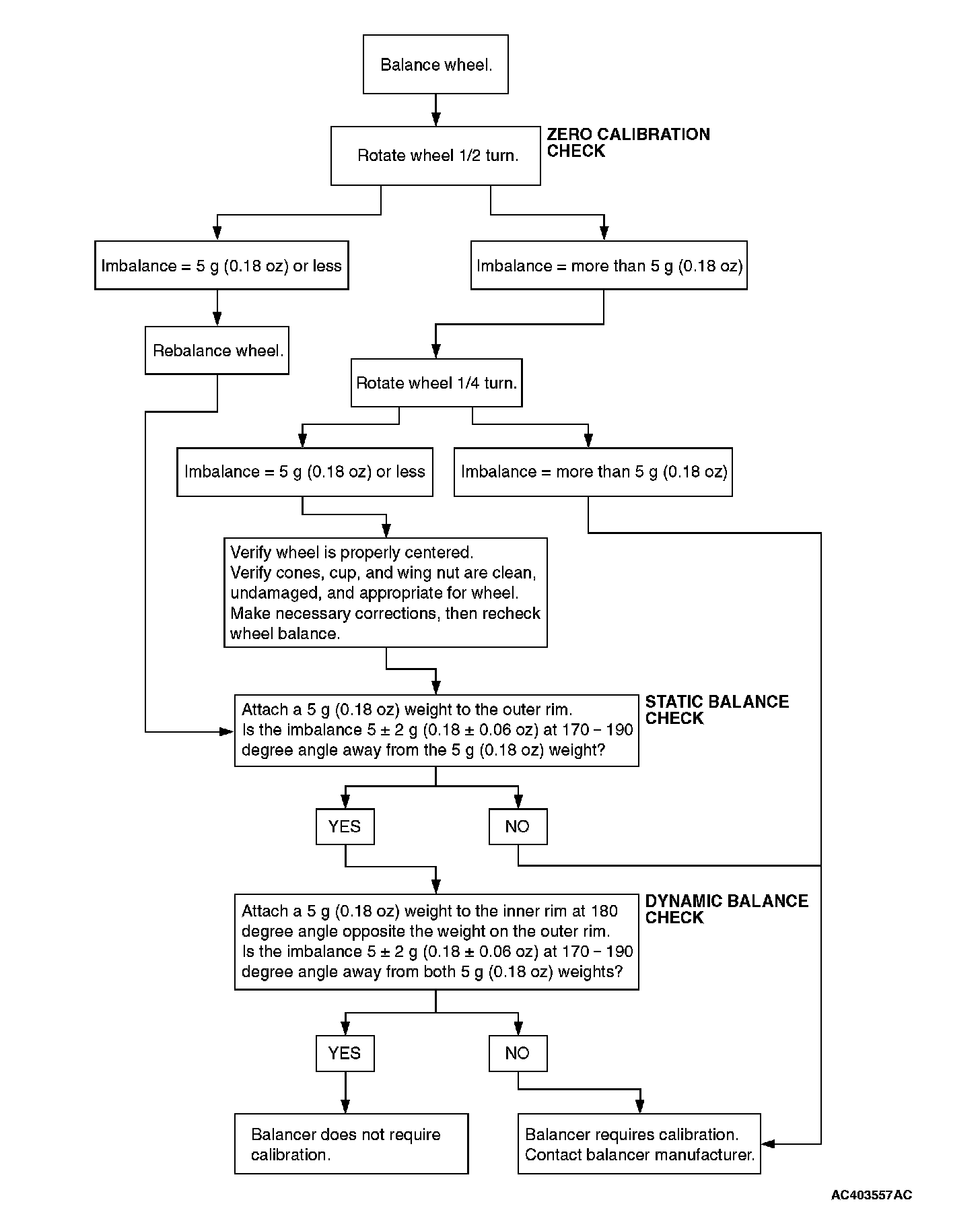 Check your balancer's calibration approximately every 100 balances. Your wheel balancer's instruction manual should include calibration procedures. If the calibration procedures specifically for your balancer are missing, use the generic steps in this section for zero calibration, static balance, and dynamic balance checks. The wheel balancer calibration checks are also described in the flowchart.