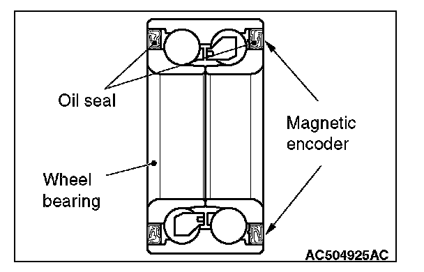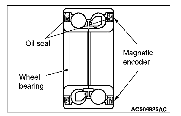 ^ When removing and installing the front wheel hub assembly, make sure that the magnetic encoder for wheel speed detection (integrated with the inner oil seal) does not contact with surrounding parts to avoid damage.
