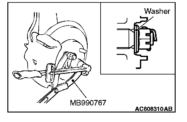 2. Using special MB990767, tighten the driveshaft nut. At this time, tighten the nut to the specified lower limit torque so that the pin hole may align with cotter pin.
