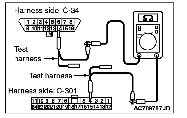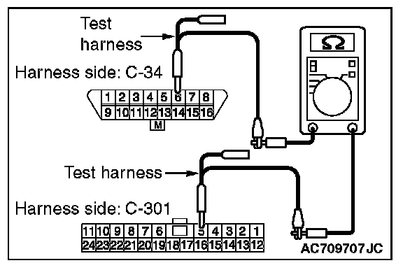 1. Disconnect the scan tool and ETACS-ECU connector C-301, and measure the resistance at the wiring harness side of data link connector C-34.