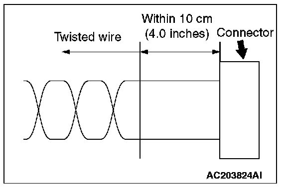 - If the connector or wire on the main bus line or the sub-bus wire is replaced, the frayed end of the twisted wire should be within 10 cm (4 inches) from the connector. If it exceeds 10 cm (4 inches), twist the wiring harness just like the original twisted wire. If the frayed end exceeds 10 cm (4 inches), noise suppression is deteriorated, causing a communication error.