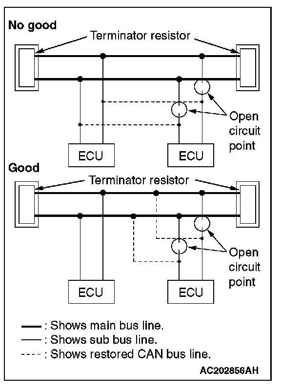 If one-side terminator resistor is broken, the CAN communication will continue although noise suppression is deteriorated. No diagnostic trouble code may be set even if the terminator resistor was broken. If damage is found, replace the ECU which incorporates the defective terminator resistor.