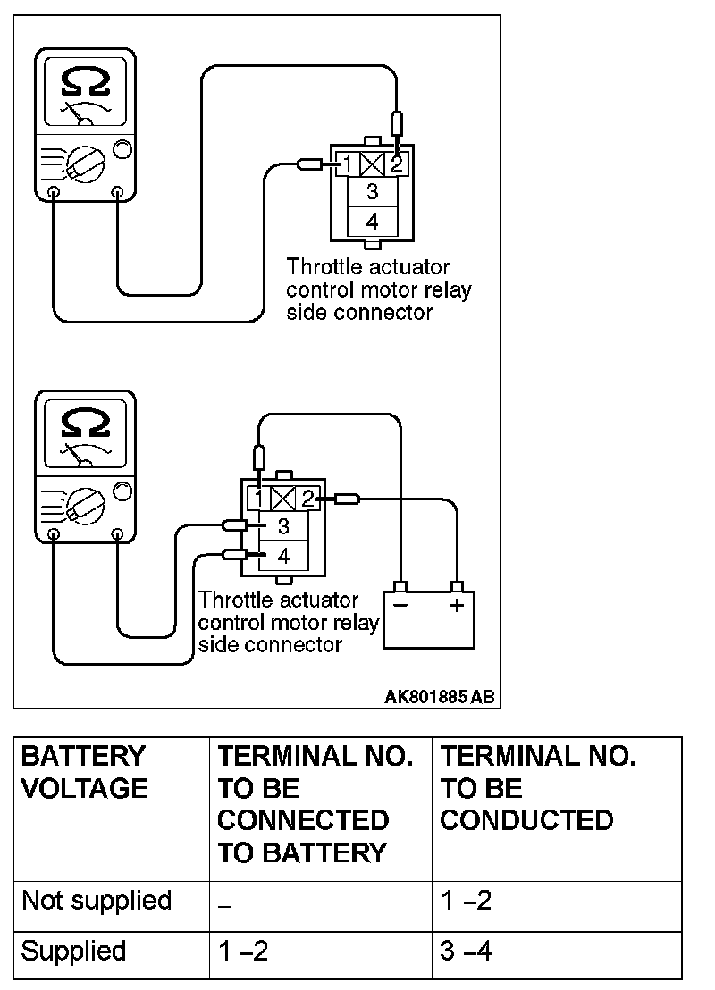 Inspect the throttle actuator control motor relay for continuity in accordance with the chart shown below.