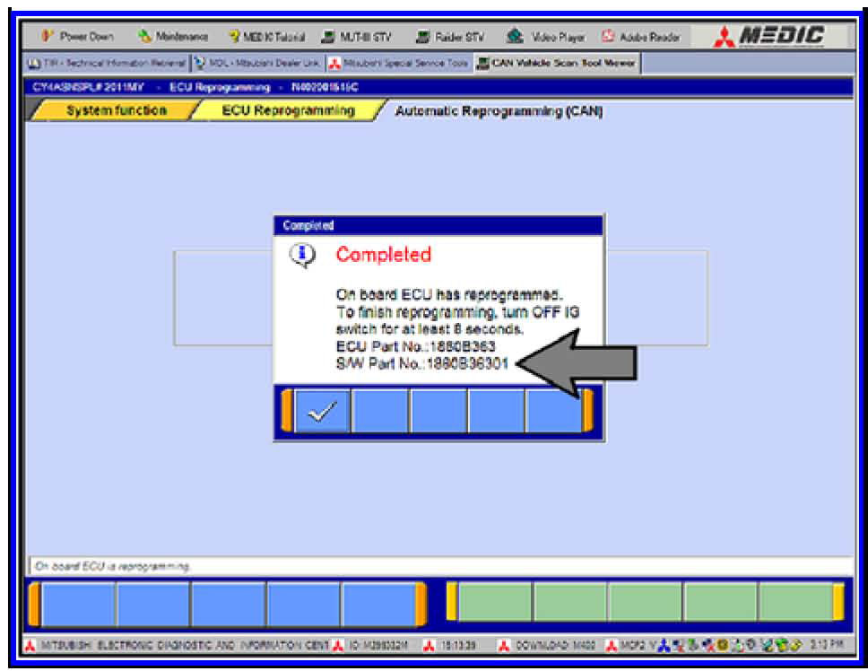 q. This message will display when ECM reprogramming is successfully completed. Confirm the "S/W P/N" displayed matches the "New S/W P/N" in the table at the beginning of this TSB.