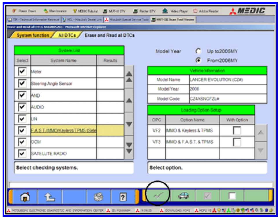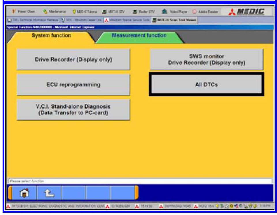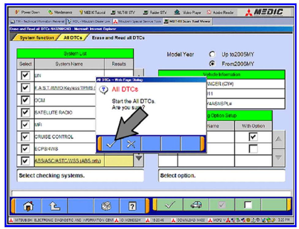 3. Using the MUT-III, check and erase ALL DTCs from all systems as follows.