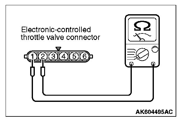 NOTE: If the measured resistance deviates from the standard value, fully open the throttle valve with your finger more than five times, then check the result again. If the throttle actuator control motor is not used for an extended period of time, the resistance may be increased as a result of internal forming of oxide film. Therefore, it means that the oxide film can be removed through a self cleaning capability of the throttle actuator control motor, if forcibly moved.