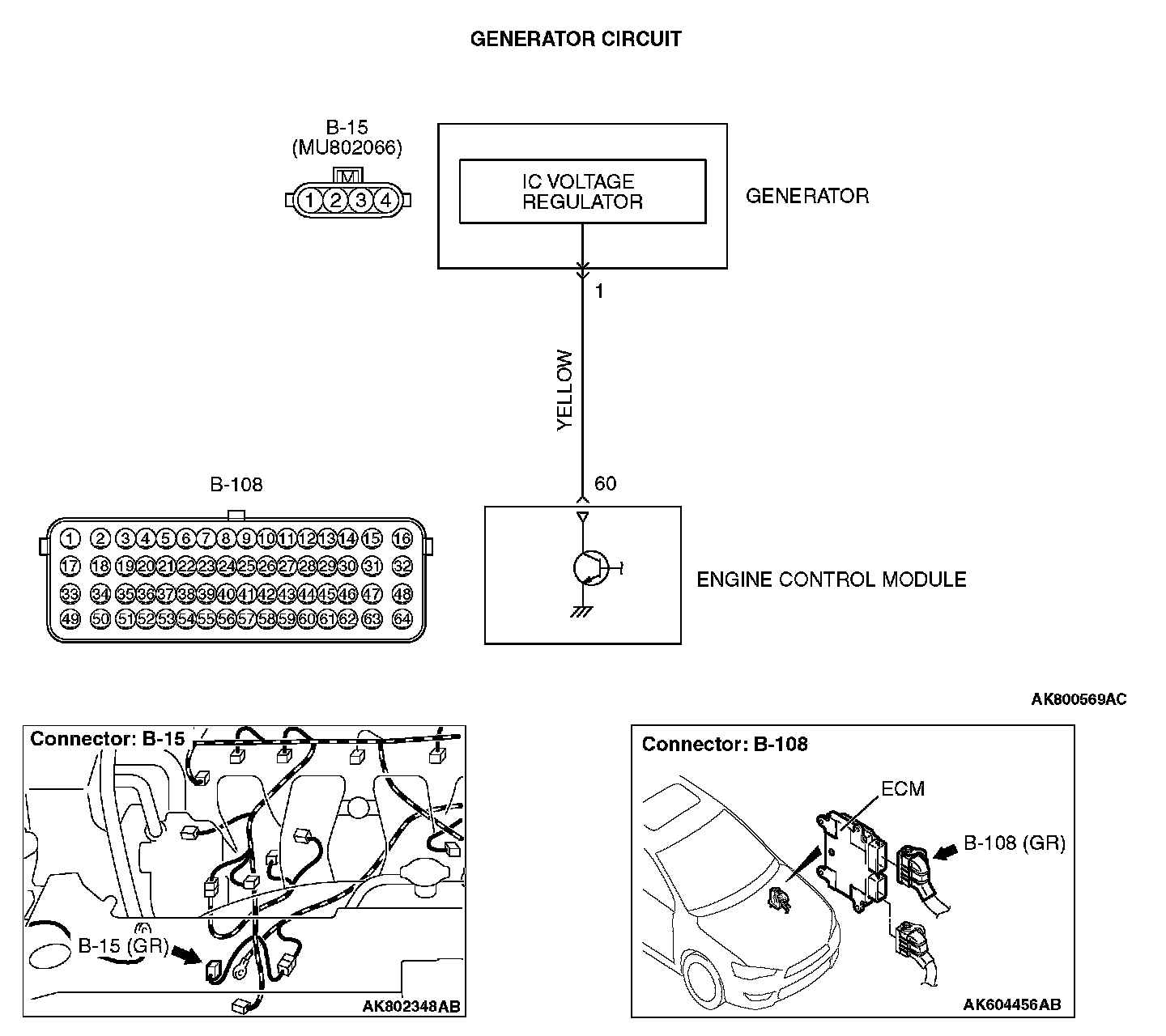 STEP 4. Check for short circuit to ground between generator connector B-15 (terminal No. 1) and ECM connector B-108 (terminal No. 60).